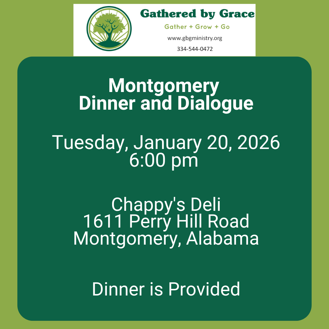 Join us in-person on Tuesday, January 20 at 6 p.m. for Dinner and Dialogue at Chappy’s Deli, 1611 Perry Hill Road, Montgomery, AL. This month’s topic is God-led Decision Making. All are welcome! Invite someone. Dinner is provided. We’d love for you to join us for a great faith-based discussion and fellowship!